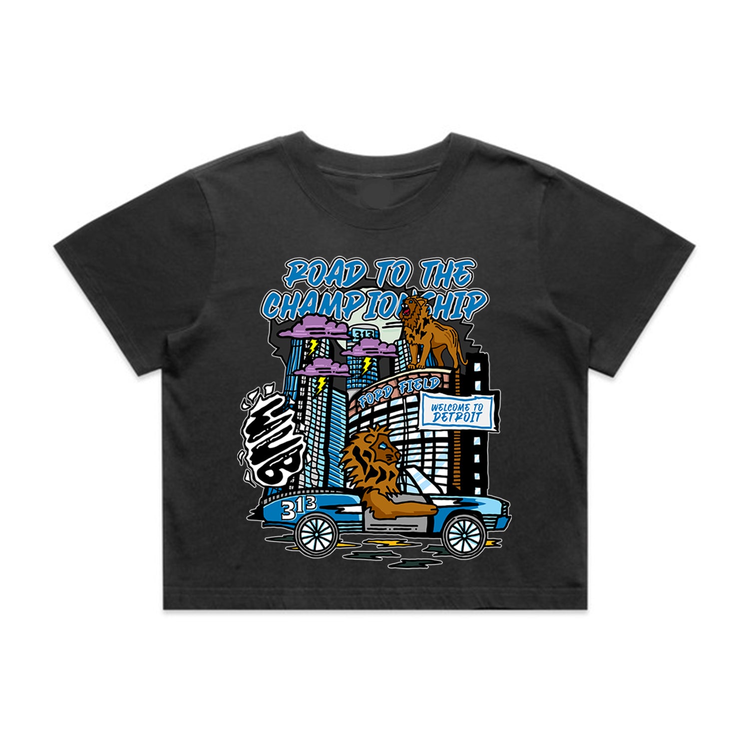 DETROIT ROAD TO THE CHAMPIONSHIP LADIES HEAVY FADED CROP TEE - BLACK